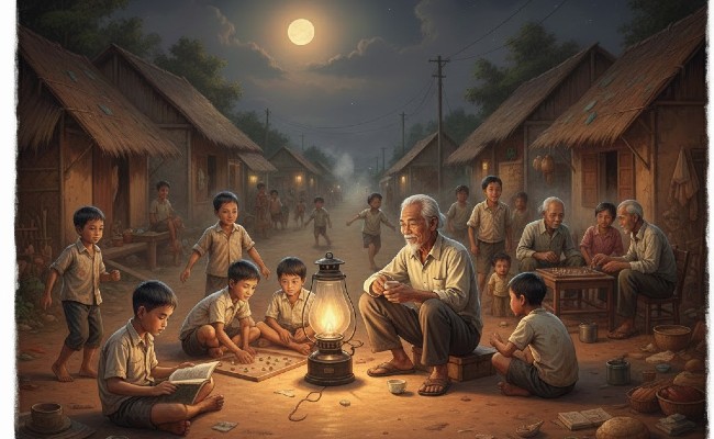 Người lớn cũng kéo đến, người đánh cờ, người trò chuyện rôm rả. Ông Hai, với nụ cười hiền hậu, chỉ lặng lẽ ngồi bên ấm trà nóng, ngắm nhìn khung cảnh rộn rã ấy. Ông chưa từng nghĩ việc mình làm có gì to tát. Với ông, thắp một ngọn đèn để lũ trẻ có chỗ học, người lớn có nơi trò chuyện sau một ngày mệt nhọc, chỉ đơn giản là niềm vui.